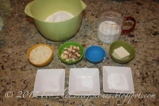1. Combine dry ingredients (both flours, baking soda, salt, and baking powder) by whisking or pulsing in a food processor. Add very cold butter cut into pieces. Crumble with fingers (or pulse in food processor) until mixture becomes sandy. Add slivered almonds and mix with wooden spoon.