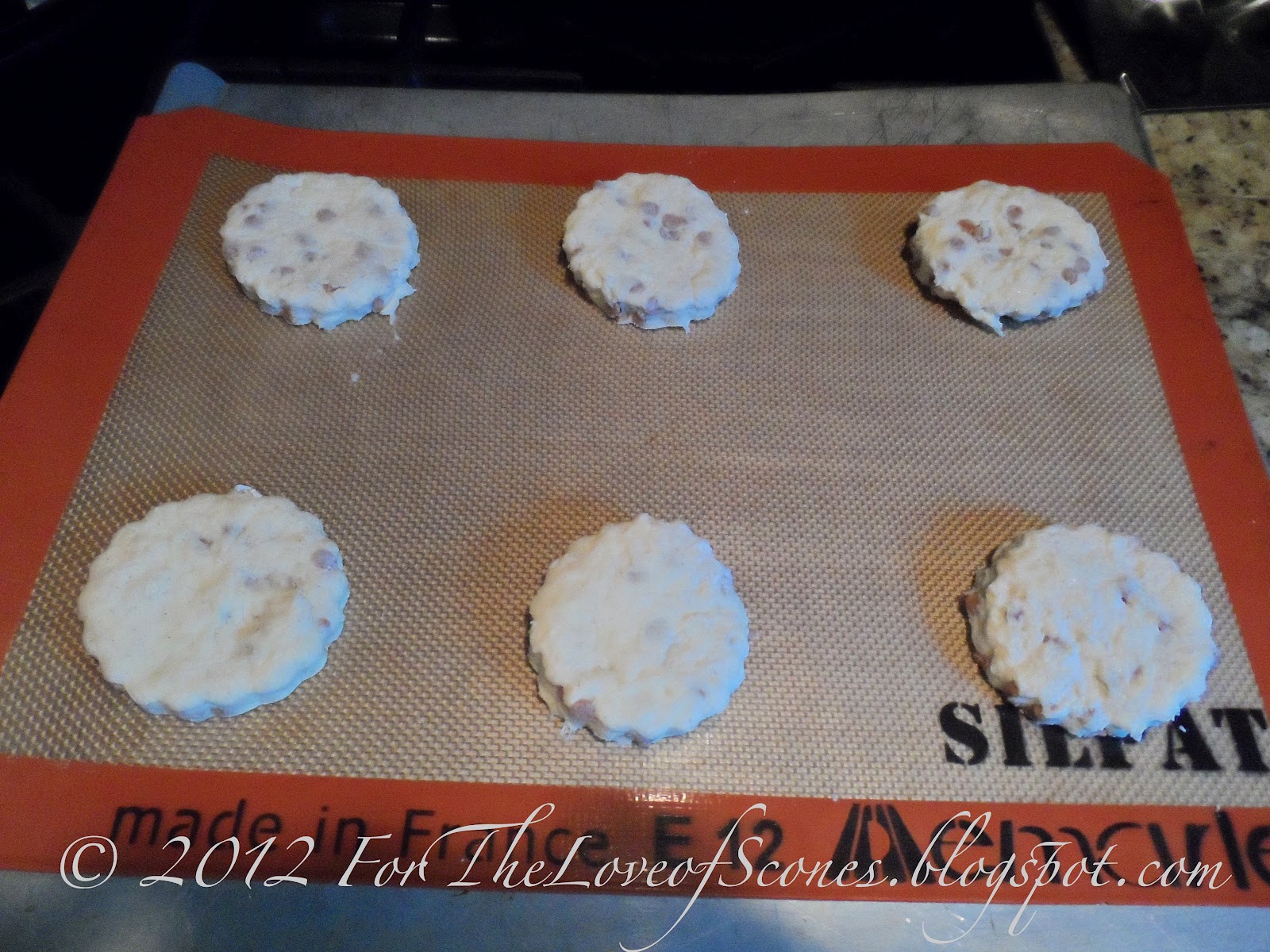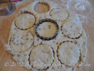 4. Knead dough once or twice to bring together. Press out dough on countertop to about 1/4 inch high and, using a round, floured cookie cutter, cut as many scones as you can from the dough. Bunch together the scrapes, kneading minimally to bring together, and press out again, cutting more scones out. With the final scraps, roll into two balls and flatten to free-form the final scones.