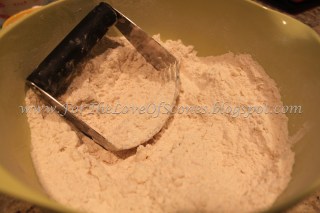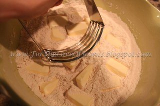 4. Add the cut up, cold butter to the dry ingredients and blend in with a pastry blender until it resembles coarse sand.