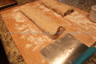 | Stretch the dough out using your hands until the dough is about 1-1/4-inch high and maybe 3 or 4 inches wide. To make this easier, I cut the log of dough in half. |