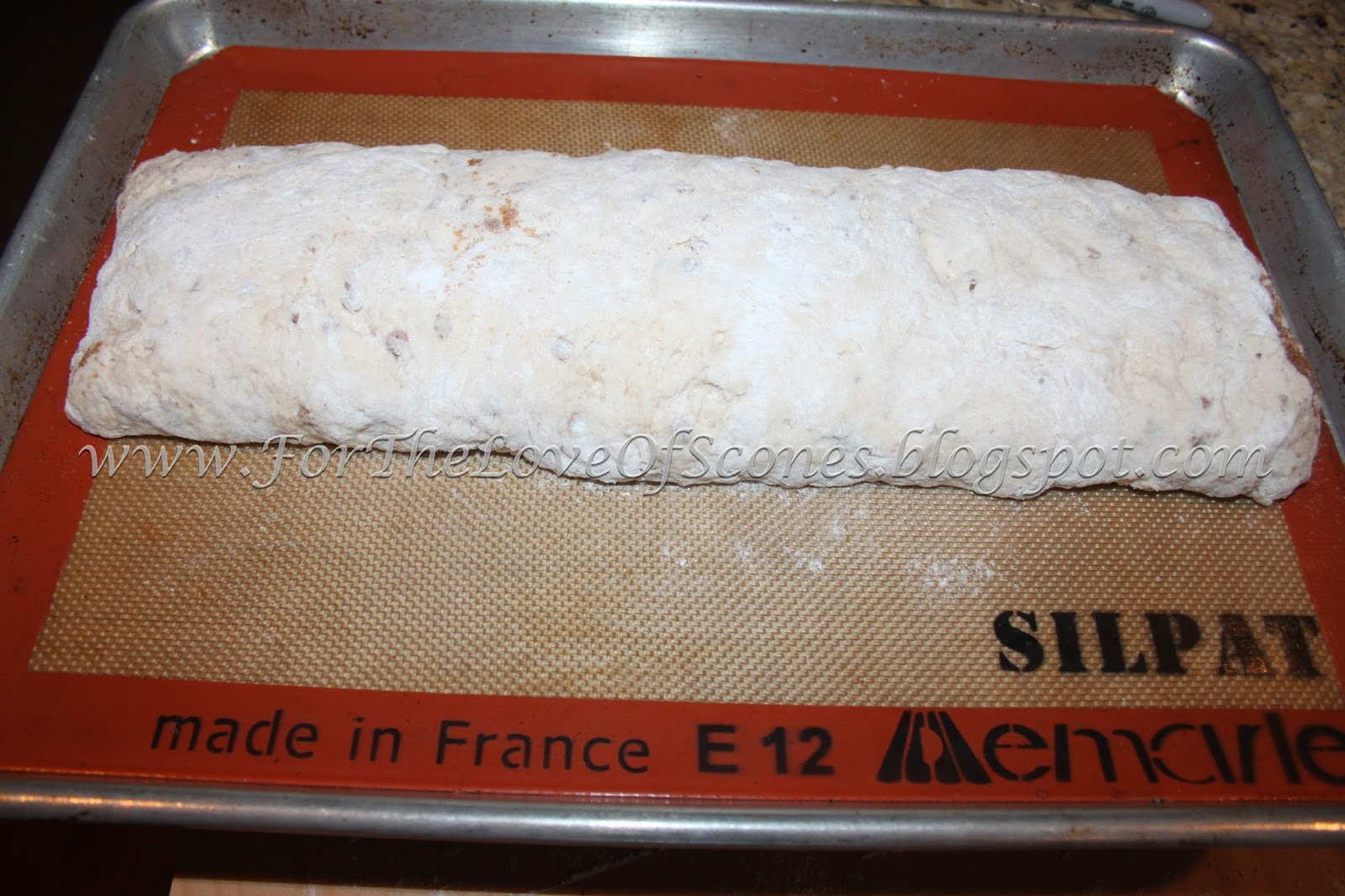 7. Liberally flour your workspace and turn the dough out onto it. Flatten into a long rectangle. If you have a small workspace, you can cut the dough in two, and create two long rectangles of equal size.