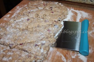 Using a bench scraper or a sharp knife, cut into squares, then cut each square in half to form scones. I got 20 scones out of this dough. |