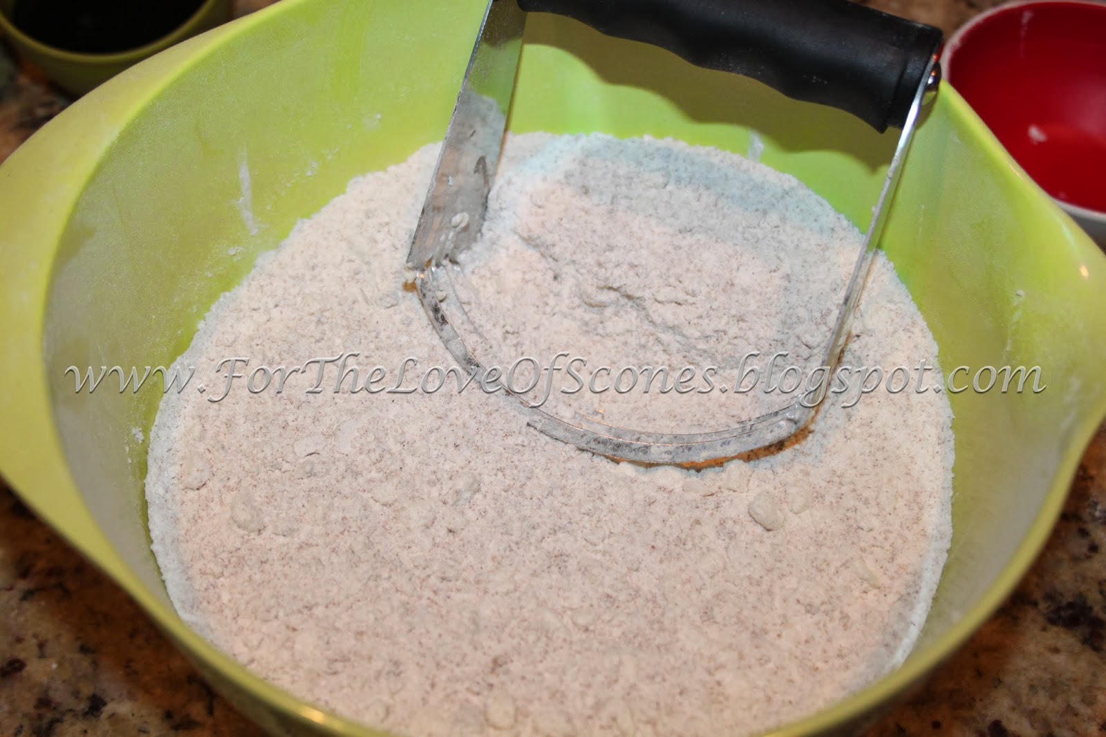 2. Add the chopped butter to the dry ingredients and blend with a pastry blender.
