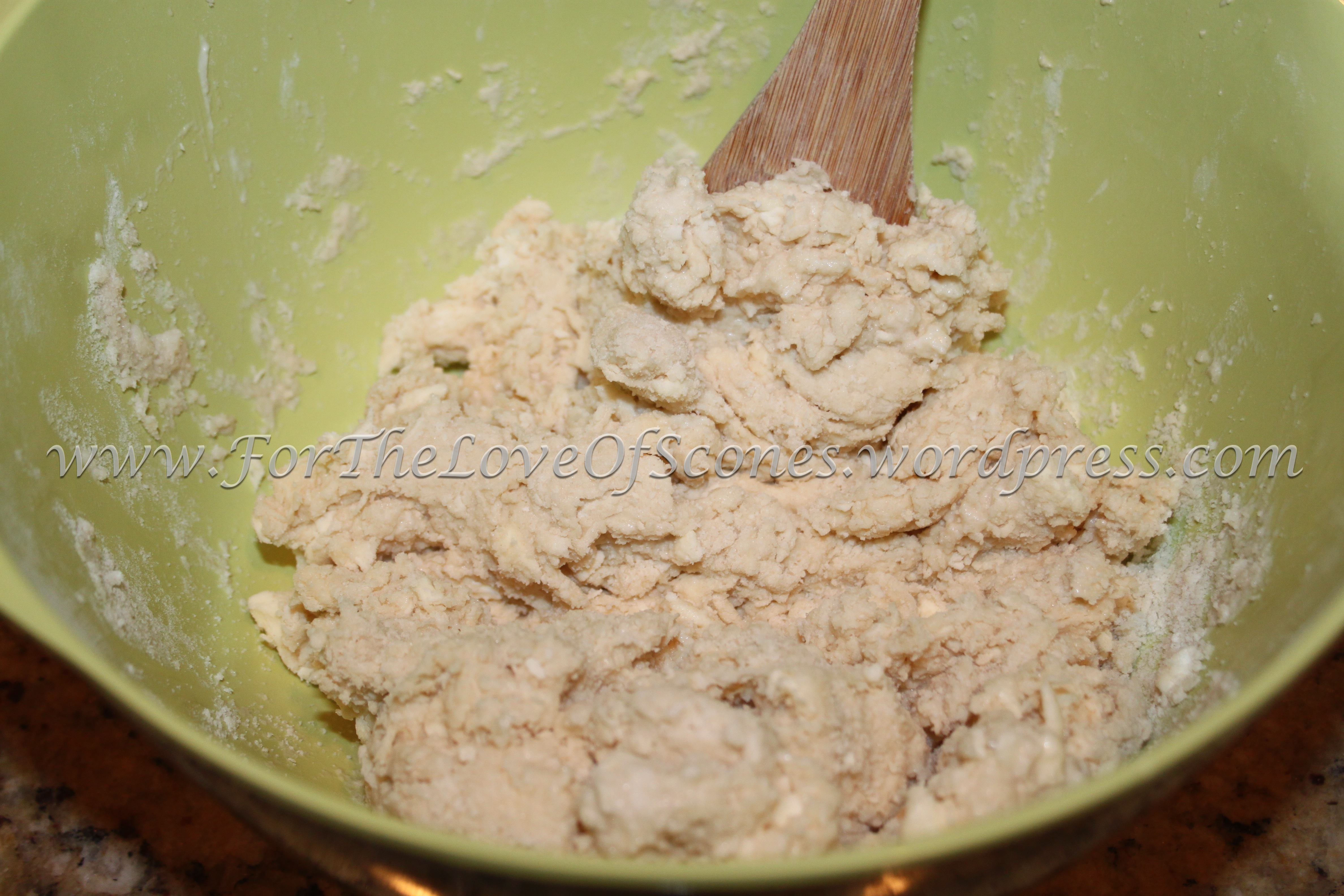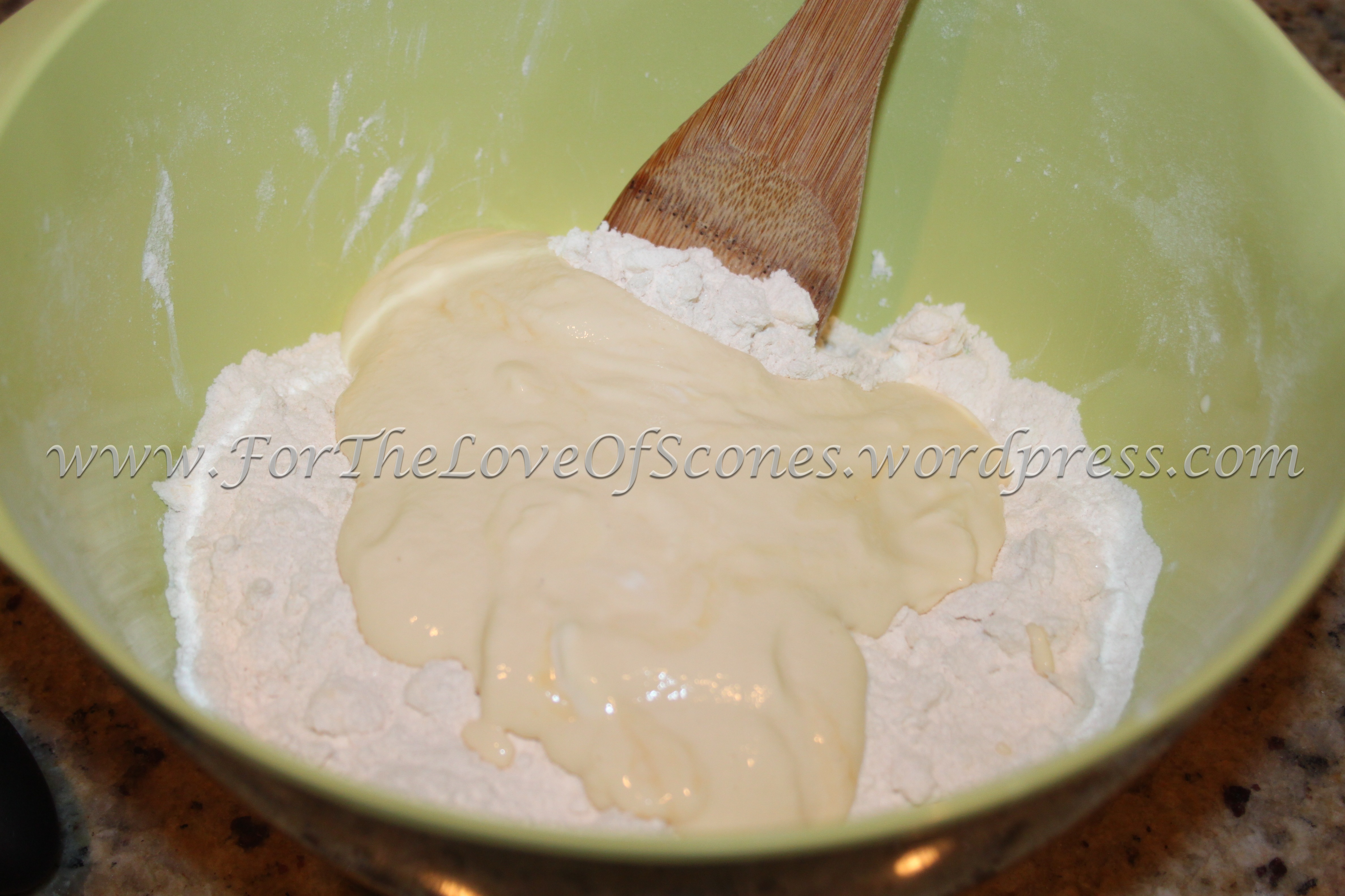 5) Add the egg and yogurt mixture over the dry ingredients and stir with a wooden spoon to mix. Add the half & half a tablespoon at a time until the dough just comes together.