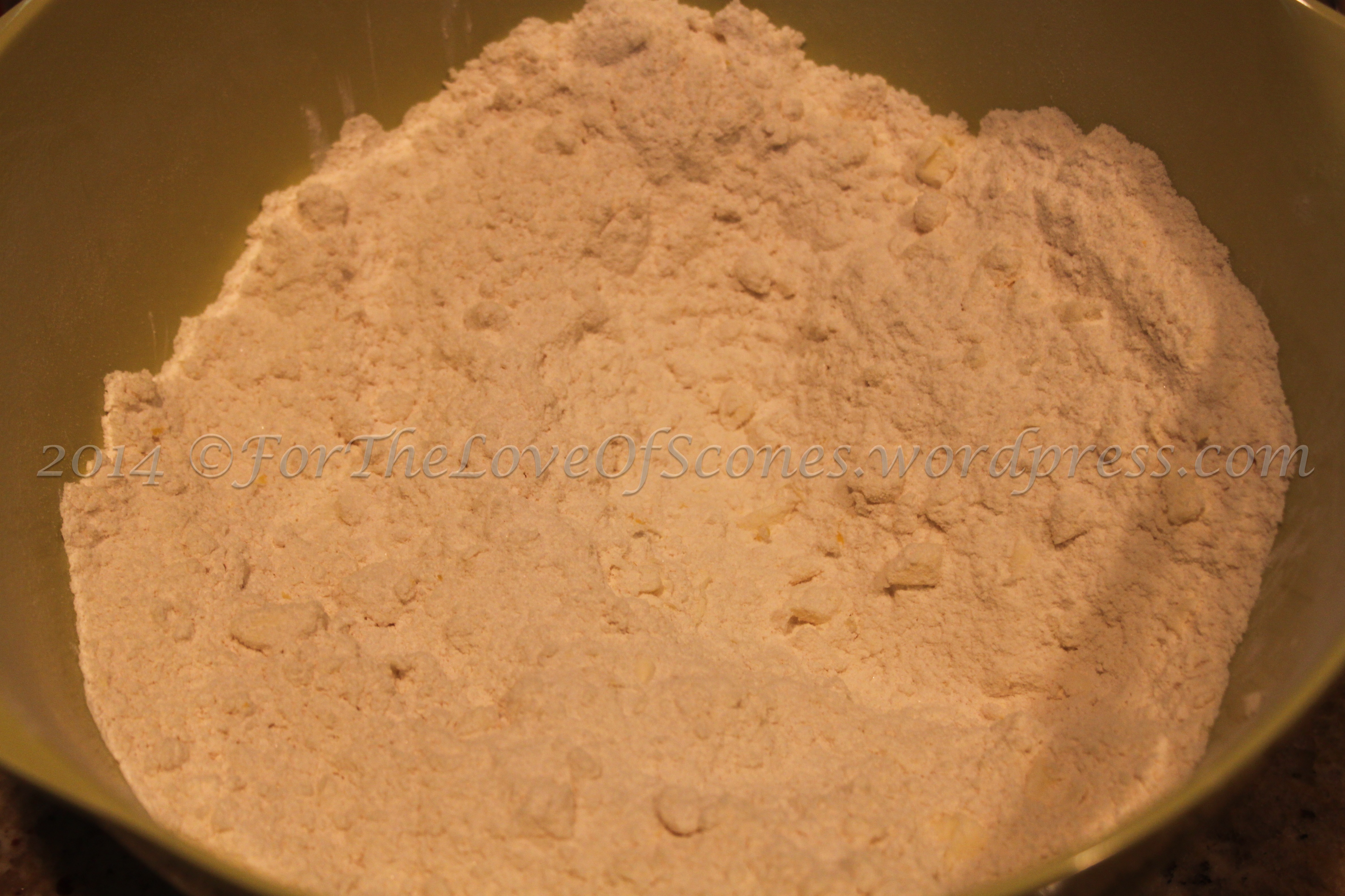 3) Add the butter and lemon zest and work into the flour with a pastry blender until only a few pea-sized pieces remain.