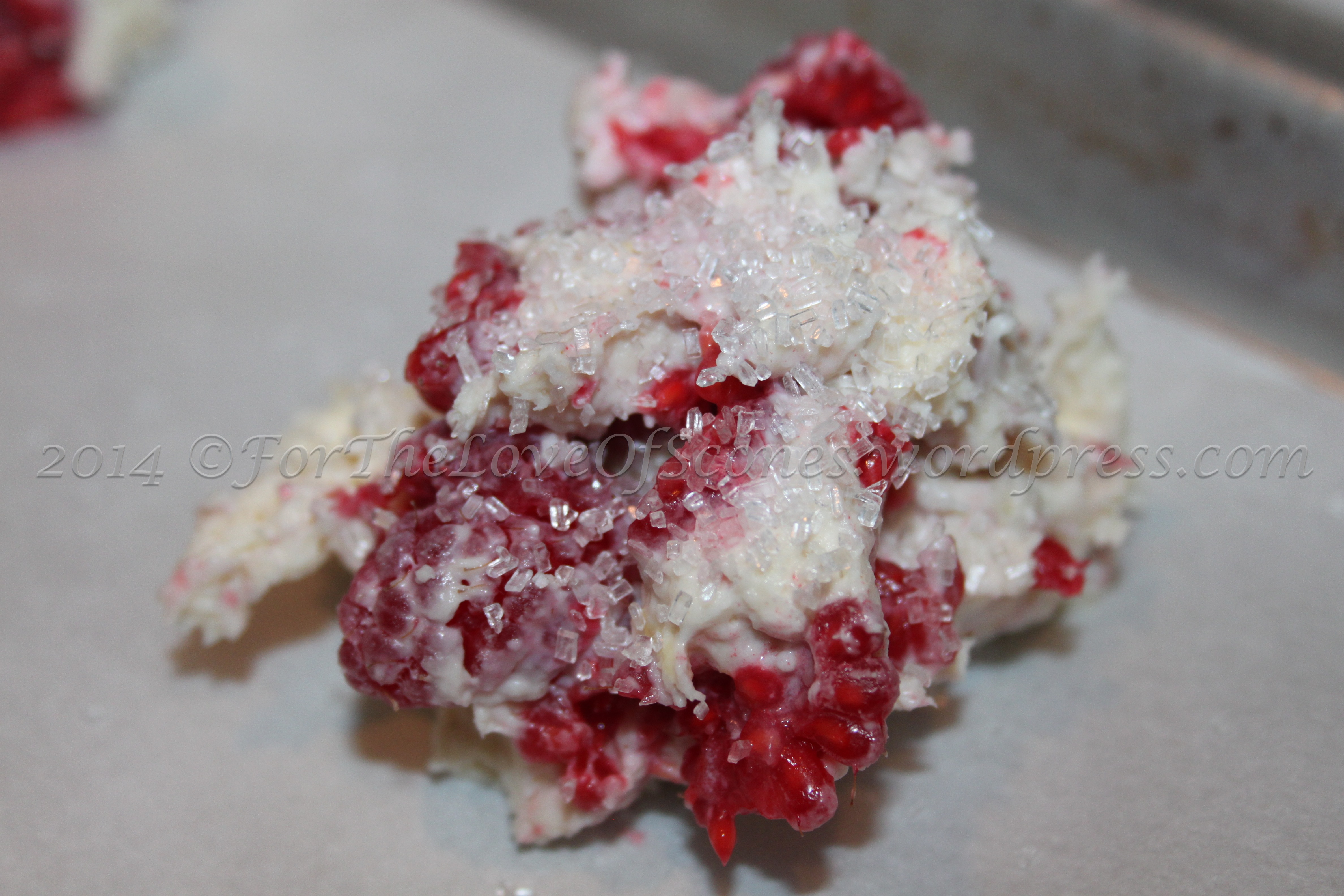 7) Add the whipping cream/lemon juice to the raspberry and flour mixture and stir with a wooden spoon to mix. The dough should be slightly sticky. Add more whipping cream if needed, but take care not to make it too sticky (as I did). *Again, my pictures are out of order because I added raspberries first. I also didn’t freeze my raspberries, so they got a bit mashed up.*