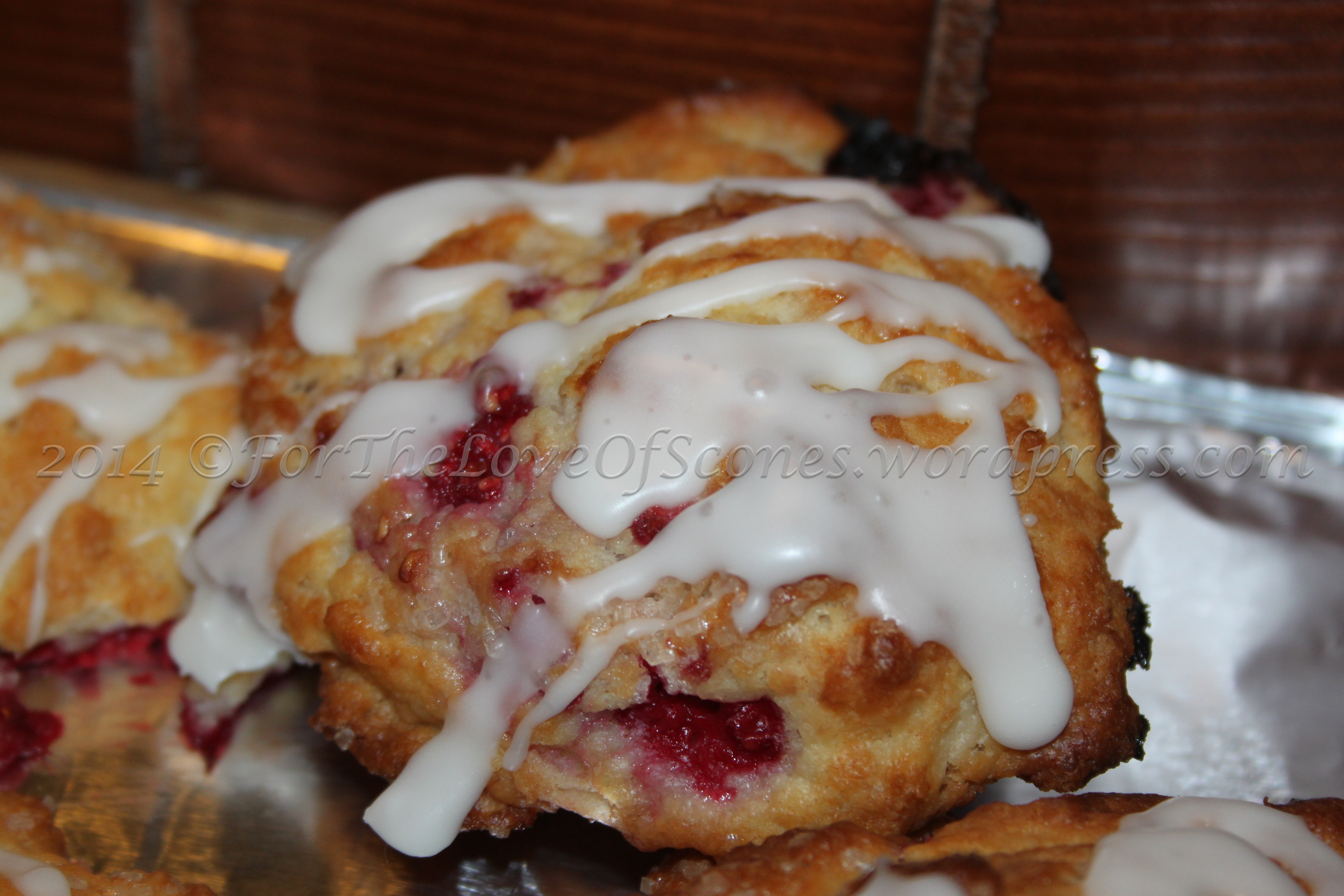 These scones were a mixture of fail and success for me. While their flavor is excellent, they spread out far too much. I needed to reduce the liquid, but had I done so, I wasn’t able to get the raspberries mixed in. In order to remedy this dilemma, I reversed the order of ingredients in my instructions. Instead of adding the fresh, unfrozen raspberries after the liquid, as I did, I would freeze the raspberries, mix them into the dry ingredients, and then add just enough liquid to bring the dough together. Time spent chilling in the freezer is necessary for these scones, as they do have a desire to spread out significantly while baking.