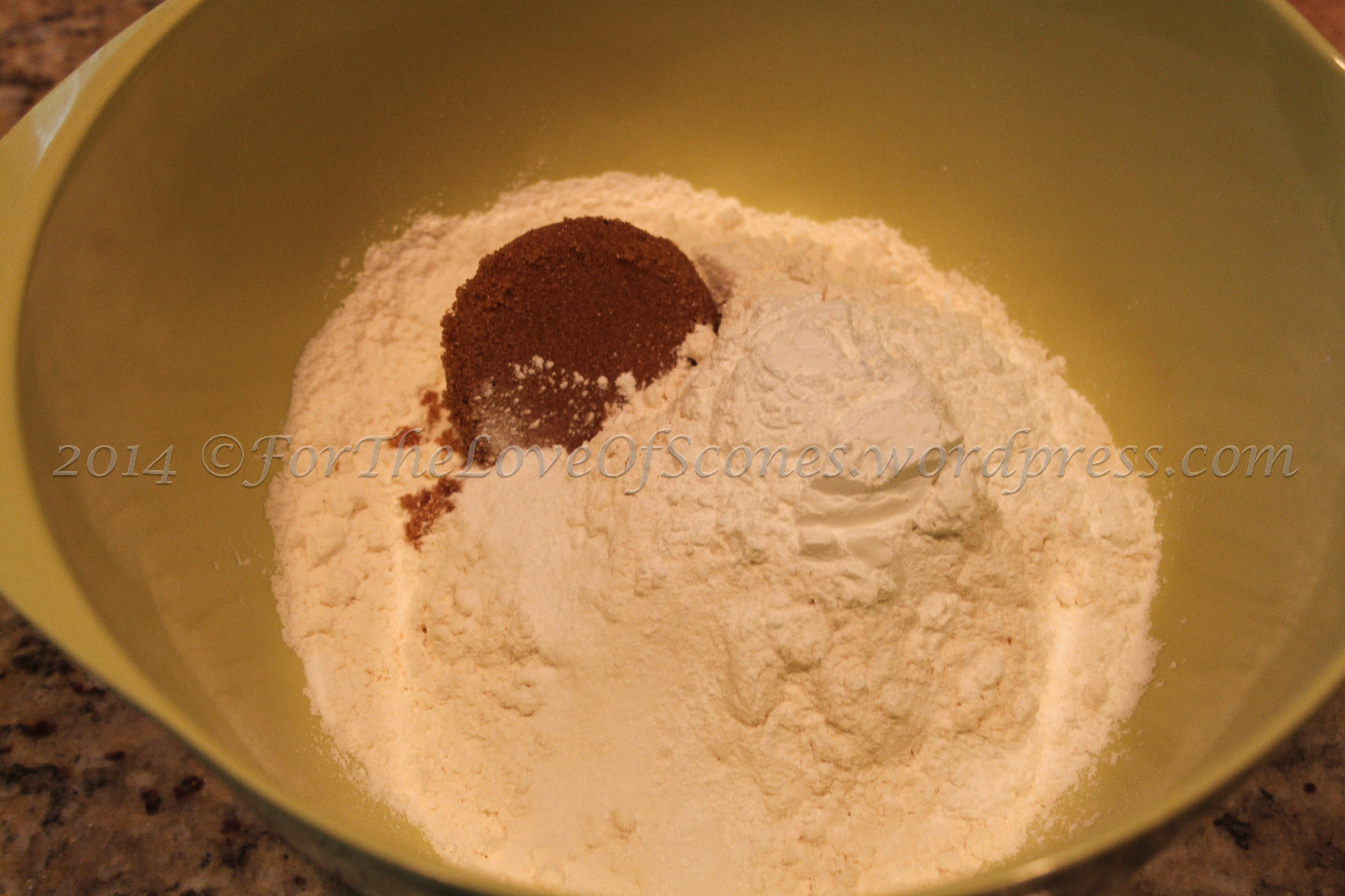 2) When your bacon is done and cooling off the stove, preheat the oven to 450ºF. Whisk the flour, brown sugar, baking powder, baking soda, and salt together in a large bowl.