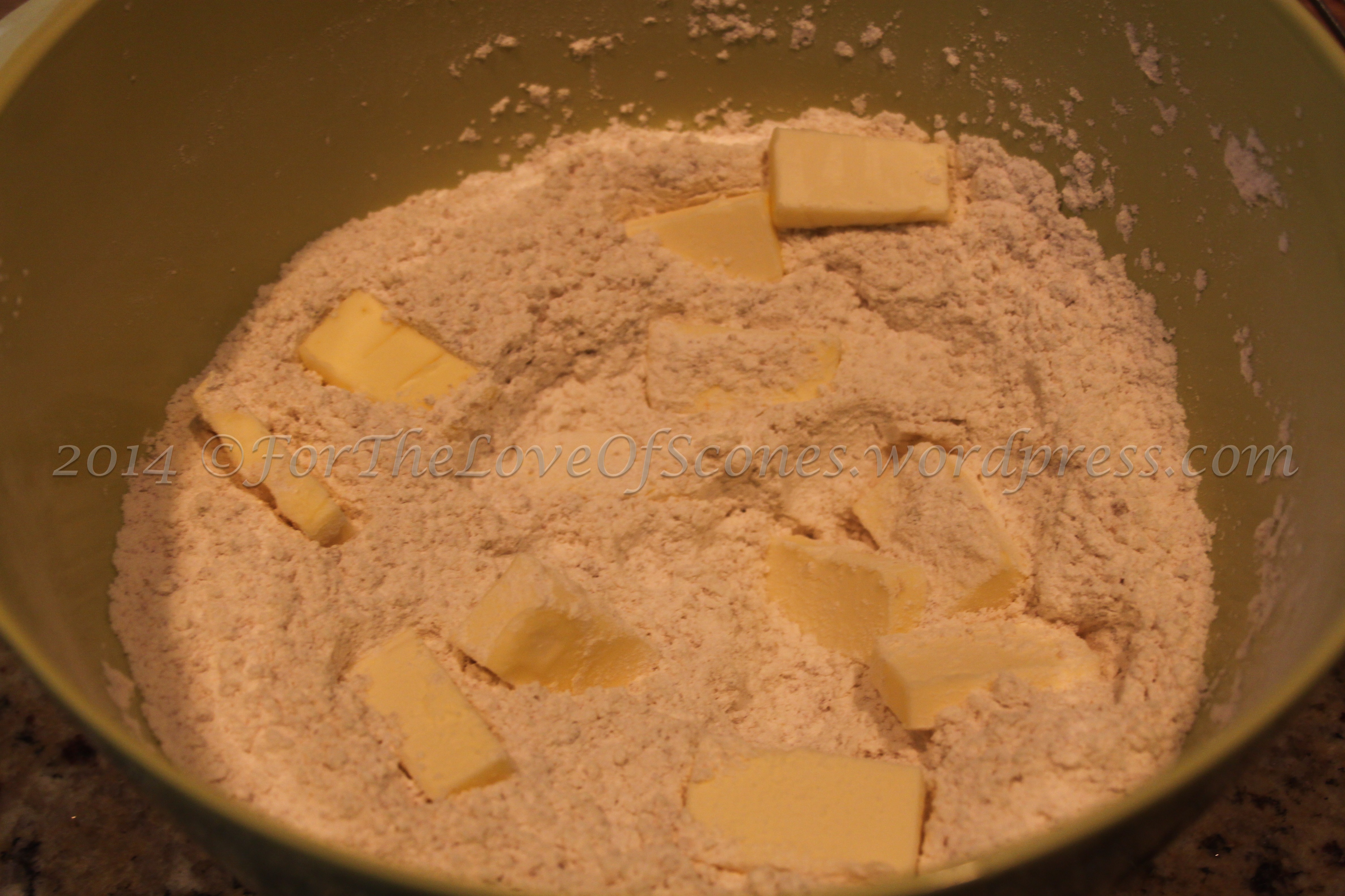 3) Add the cold, diced butter and work in with a pastry blender. A few pea-sized chunks in this recipe are okay.
