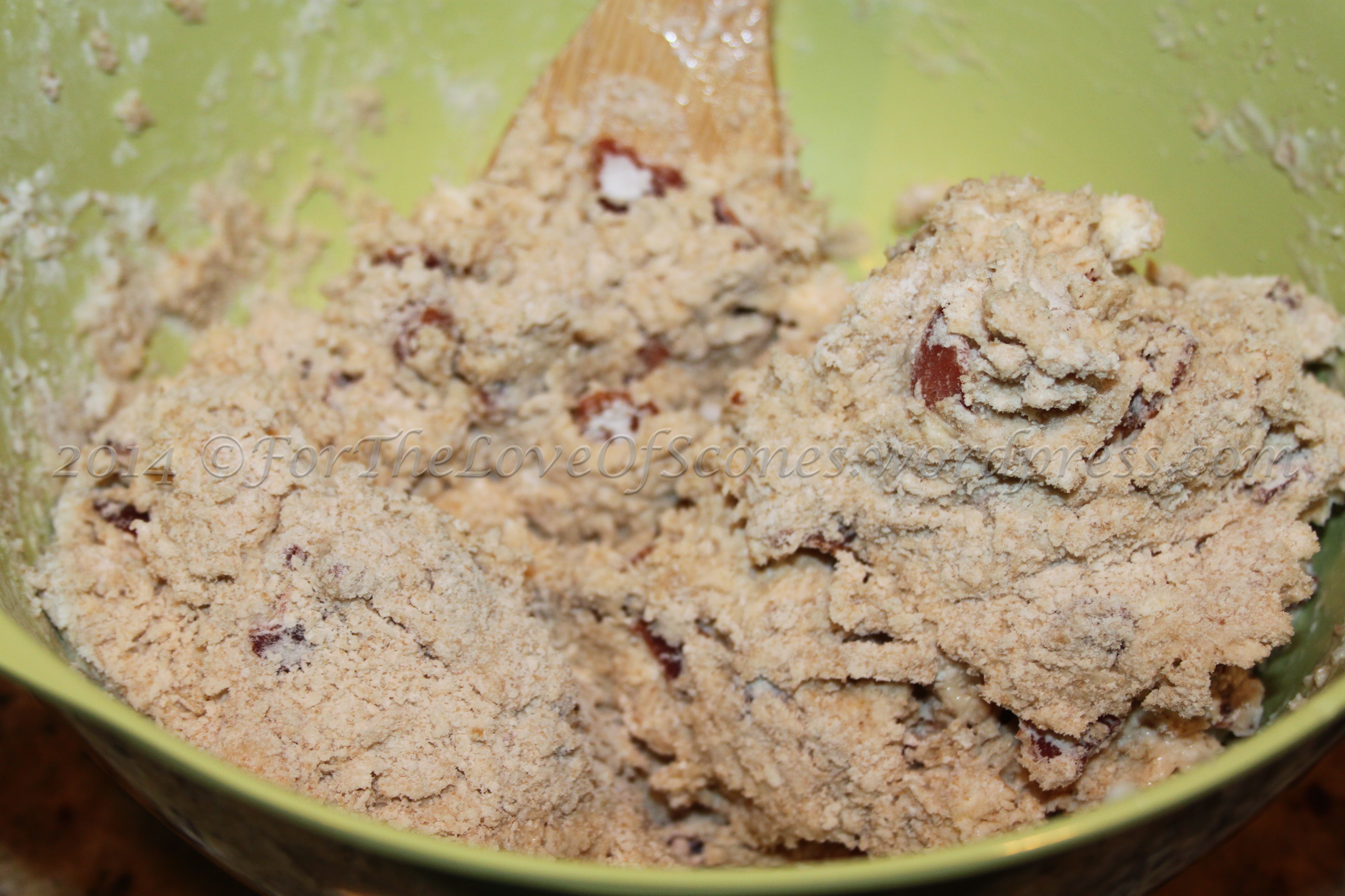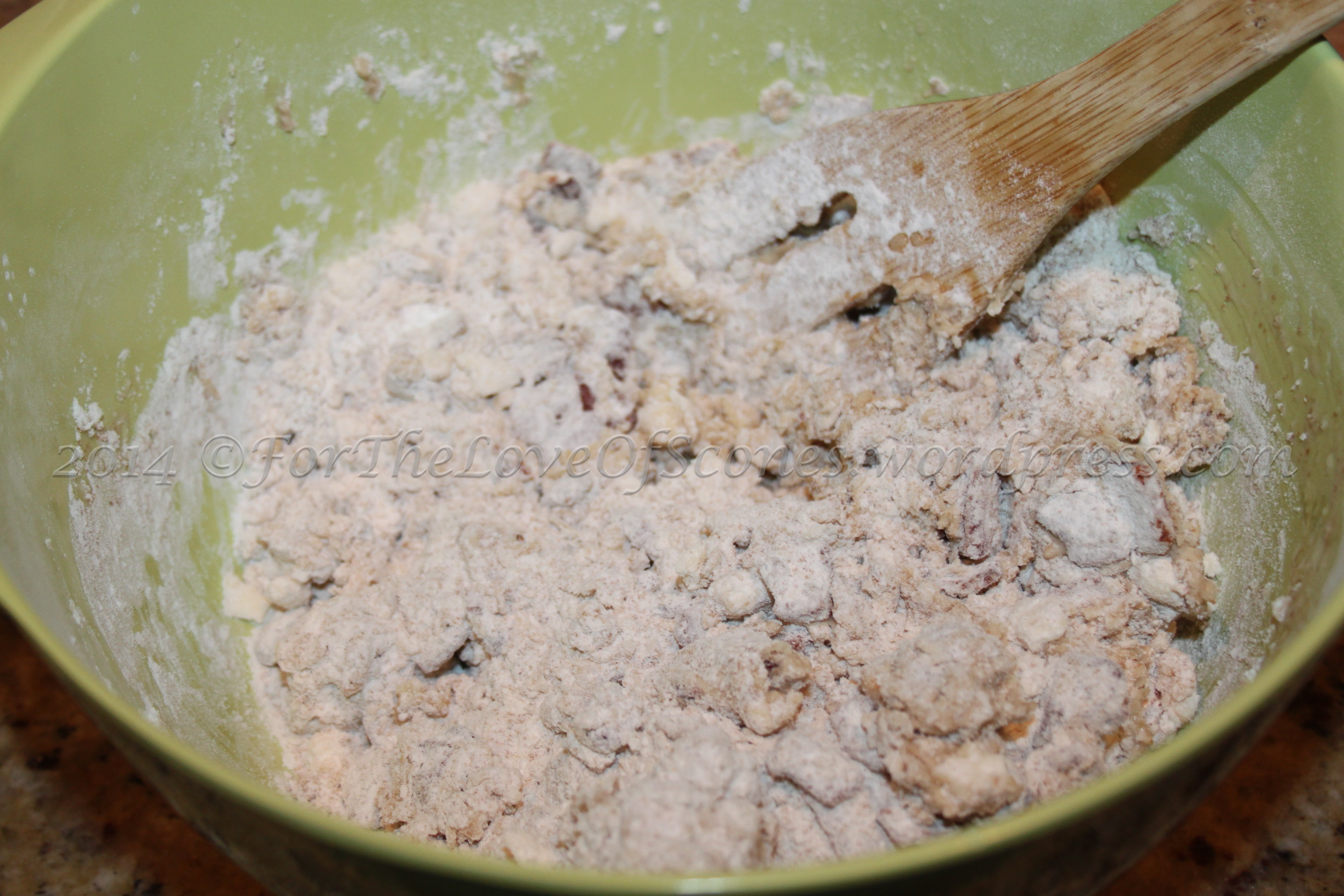 6) Add the maple syrup-buttermilk mixture to the dry ingredients and mix with a wooden spoon. Add additional buttermilk as needed–just enough to bring the dough together so that a few floury bits are left in the bottom. (When you turn out the dough and give it a knead or two, these floury bits will be worked in.)