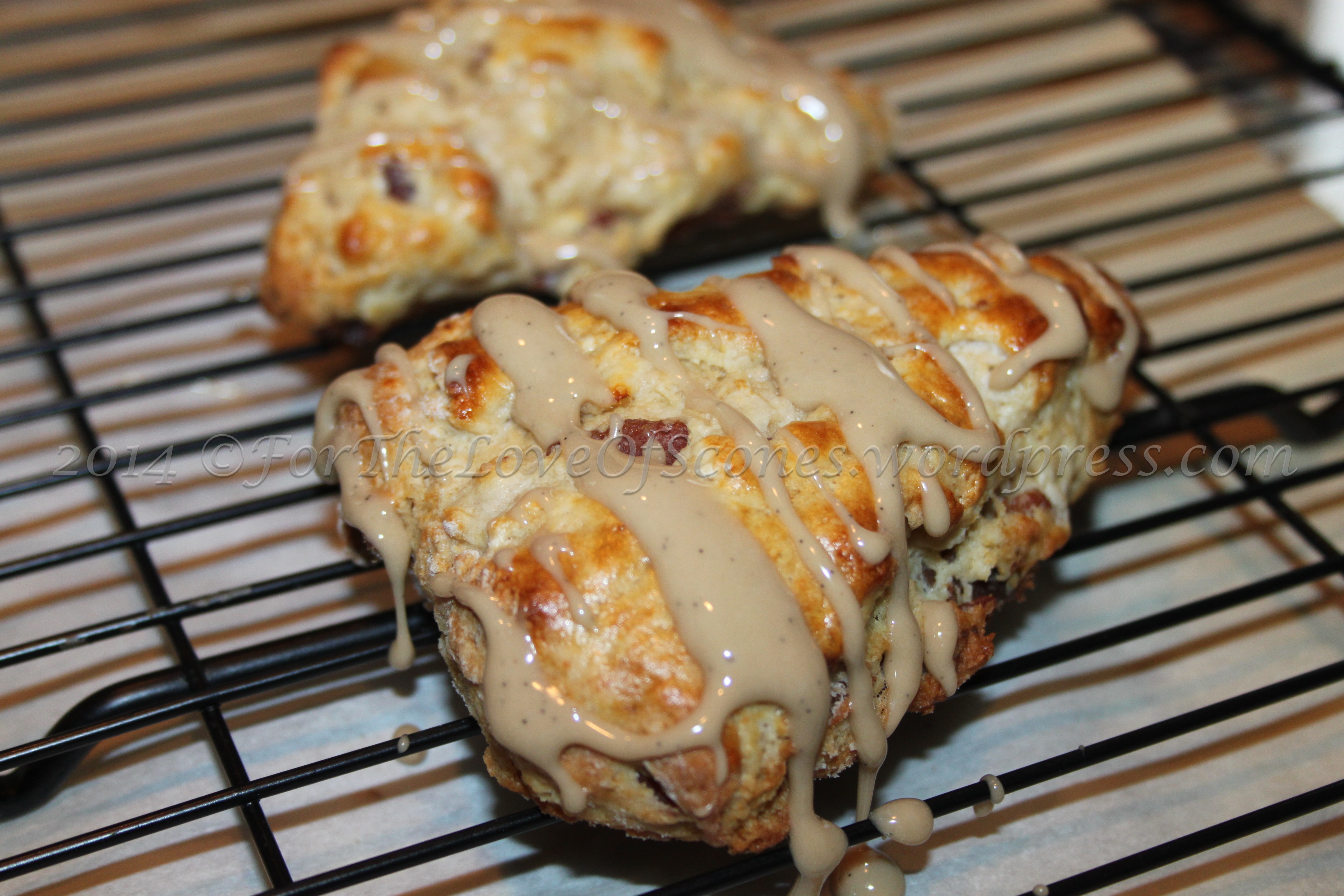 11) When the scones are done baking, allow to cool on the baking sheet for 5 minutes. Then transfer to a wire cooling rack with parchment paper underneath it to catch any icing runoff. Drizzle the scones with the icing. Allow the icing to set before enjoying.