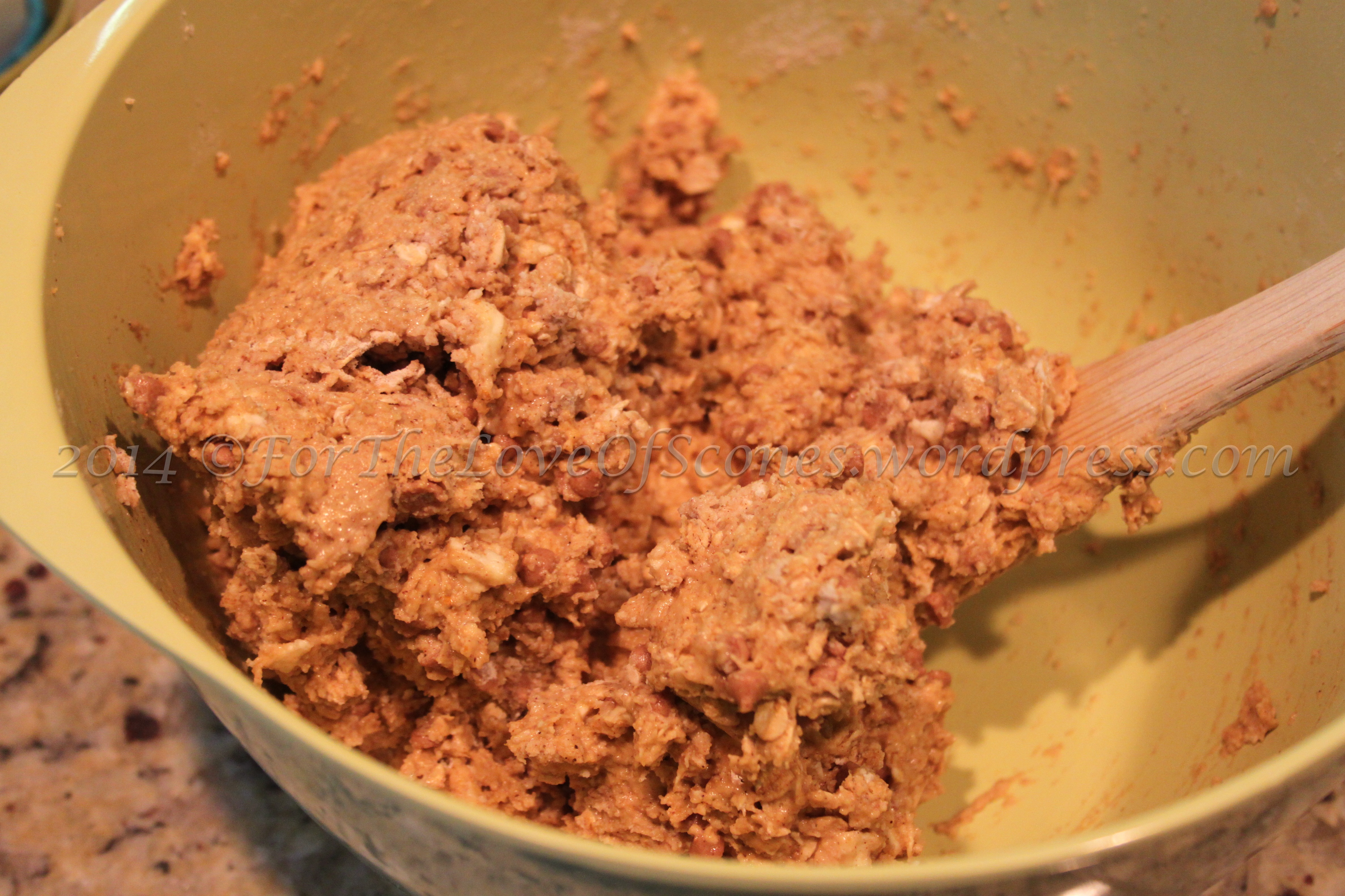 1) Preheat the oven to 400ºF. Combine the flour, oatmeal, spices, baking soda, and baking powder and whisk.